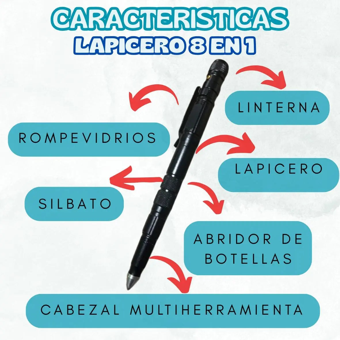 ✅ Lapicero 8 en 1: linterna, rompevidrios, silbato, abrebotellas, lapicero para escribir y más.